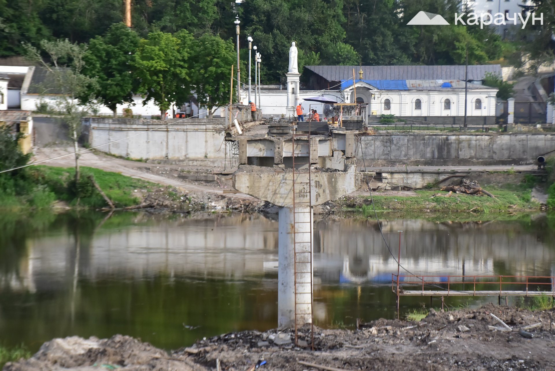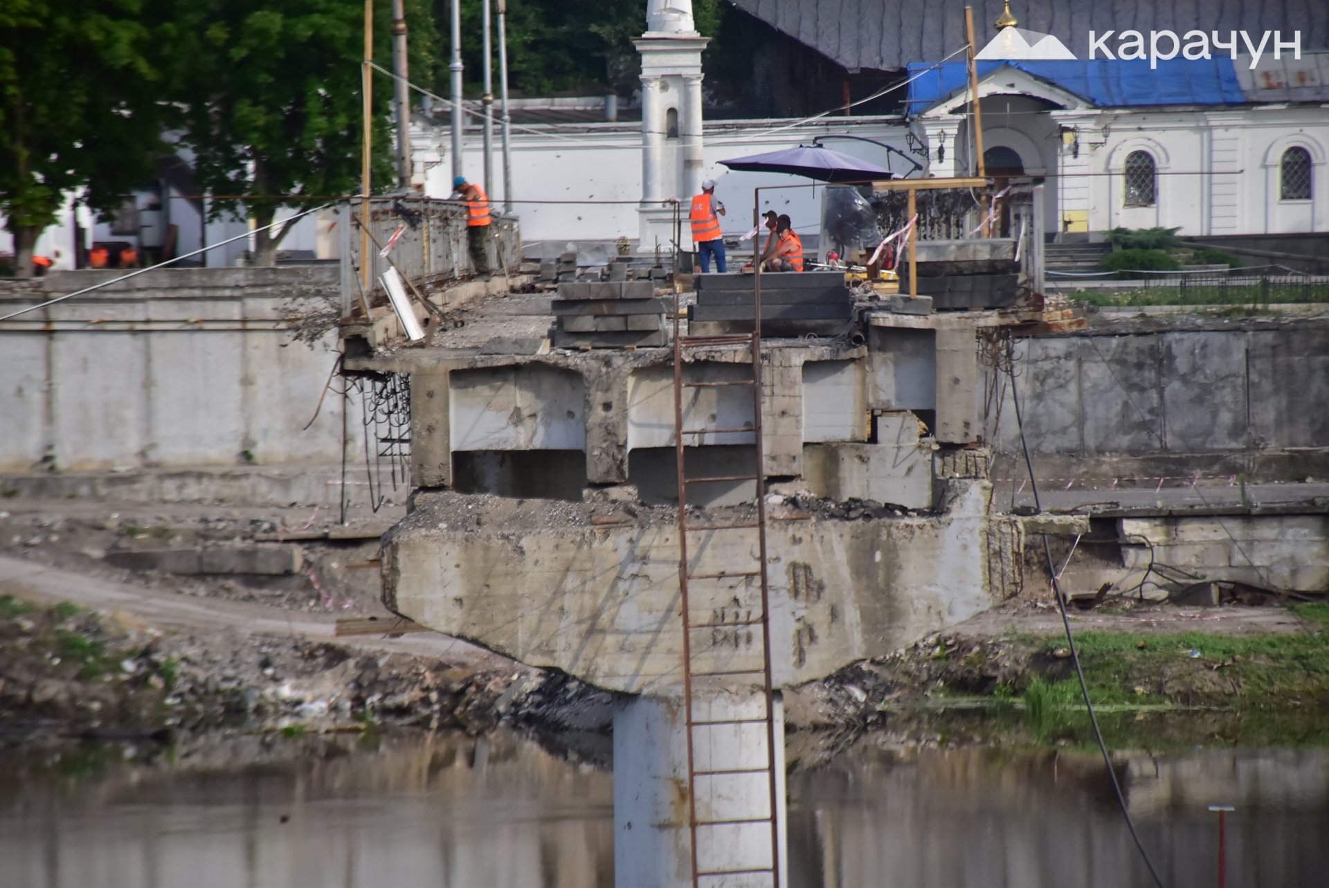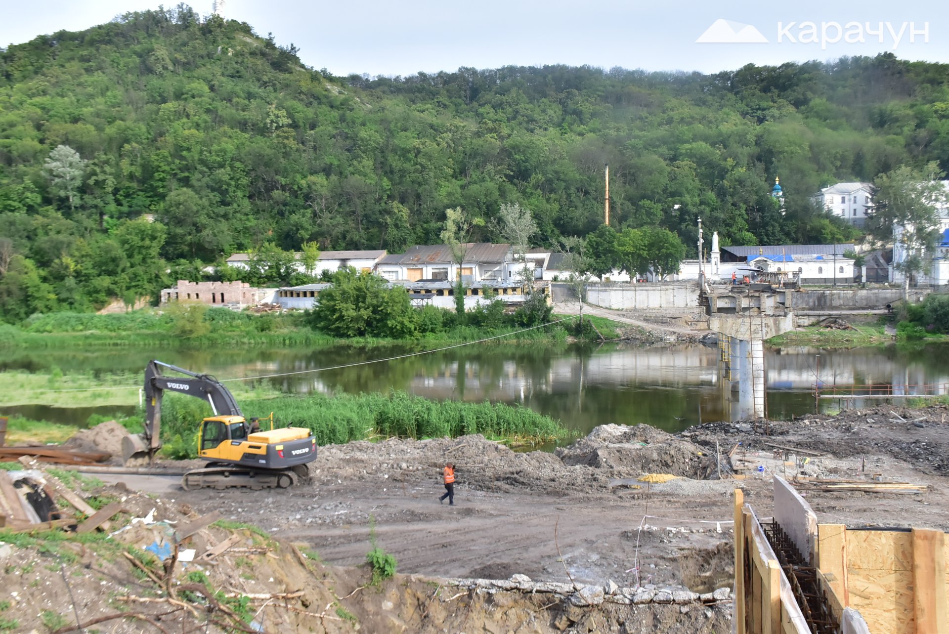 Будівельні роботи тут ідуть повним ходом: завозяться будівельні матеріали (в тому числі — потужні залізобетонні конструкції), на місцях старих паль зводяться бетонні «подушки», на які затим будуть монтуватися опорні колони моста. Працює важка техніка.