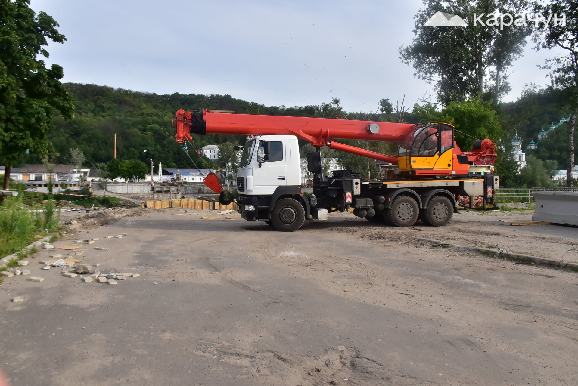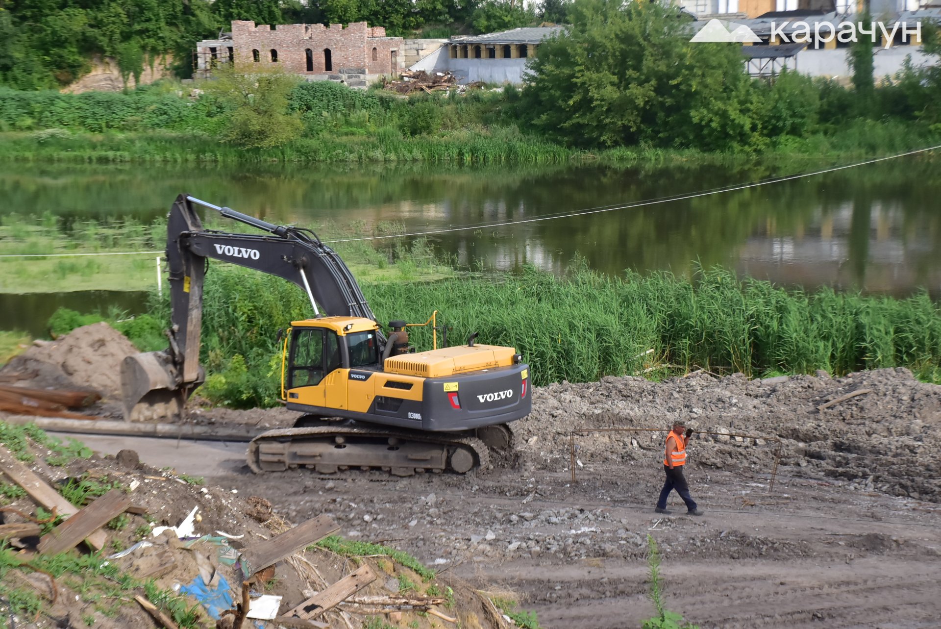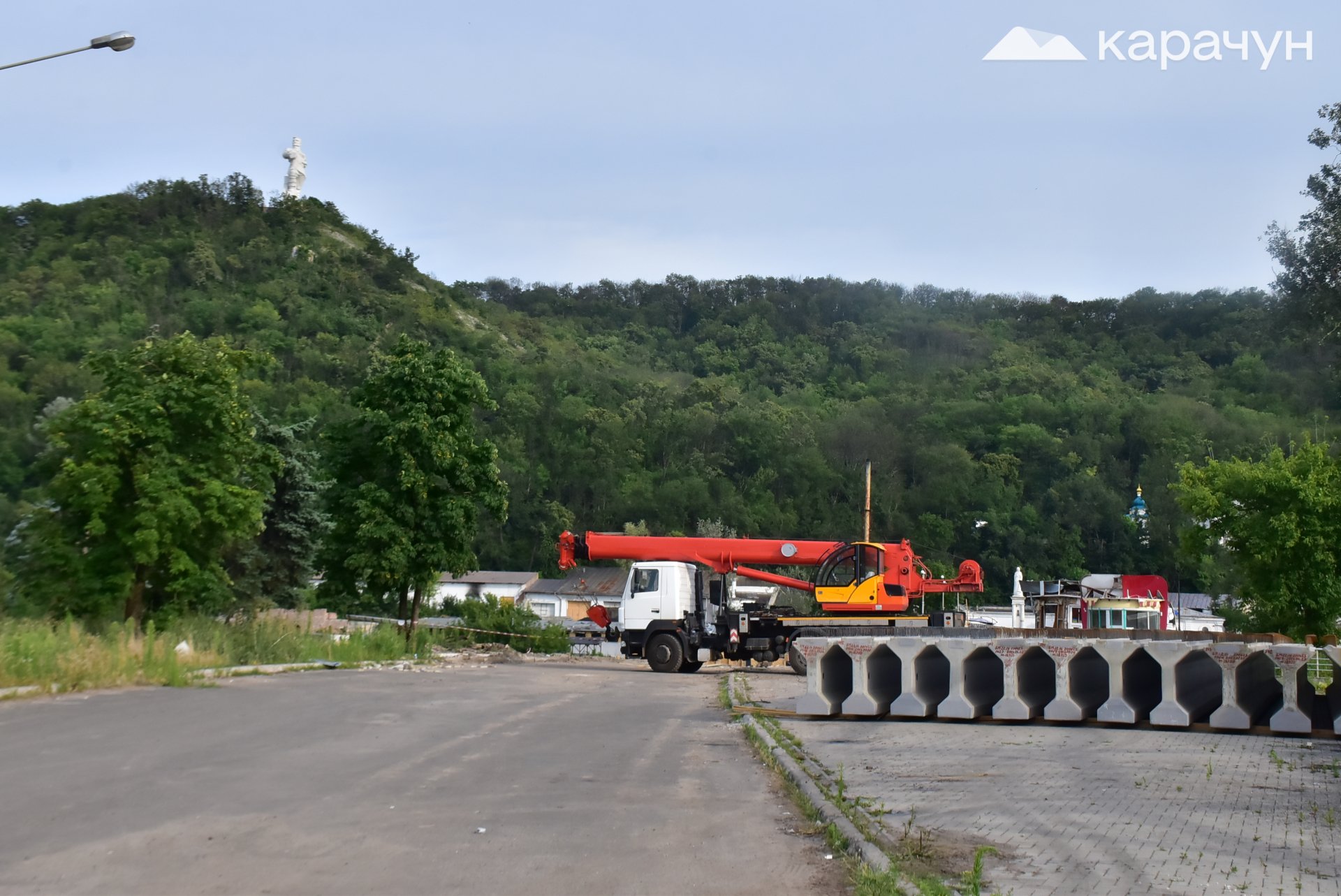 Будівельні роботи тут ідуть повним ходом: завозяться будівельні матеріали (в тому числі — потужні залізобетонні конструкції), на місцях старих паль зводяться бетонні «подушки», на які затим будуть монтуватися опорні колони моста. Працює важка техніка.