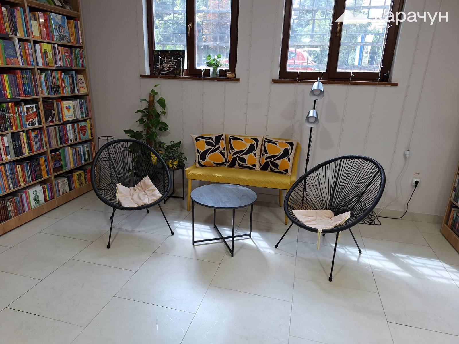 Процес вибору потрібної книги (або просто «читання для душі») інколи може затягтися настільки, що ноги покупця втомлюються. Хочеться погортати сторінки, сидячи у зручному кріслі. Господар книгарні це добре розуміє, тому й влаштував тут затишний куточок для спілкування.
