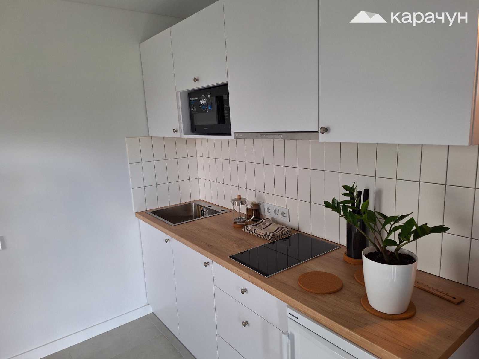 Так само обладнана усім необхідним (електроплитою, мийкою, посудом) кухня кожної квартири. Робоча поверхня, навісні шафи для посуду — все продумано до дрібниць. Тут є все для комфортного життя мешканців будинку.