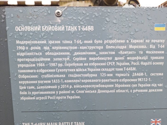 Як зазначено на табличці, цей танк у 2014 році був захоплений військовослужбовцями Збройних сил України під час боїв з противником у районі Слов’янська.