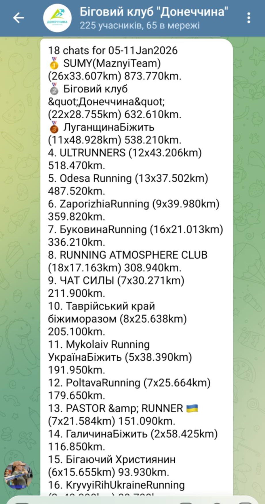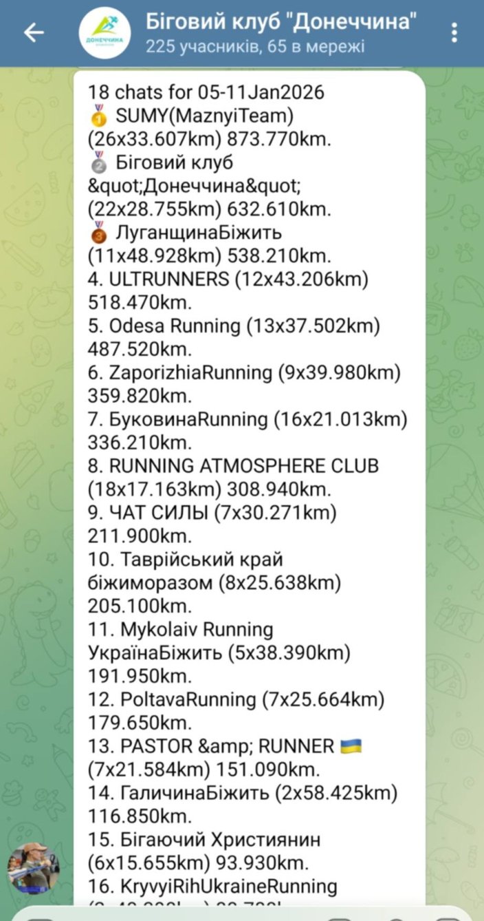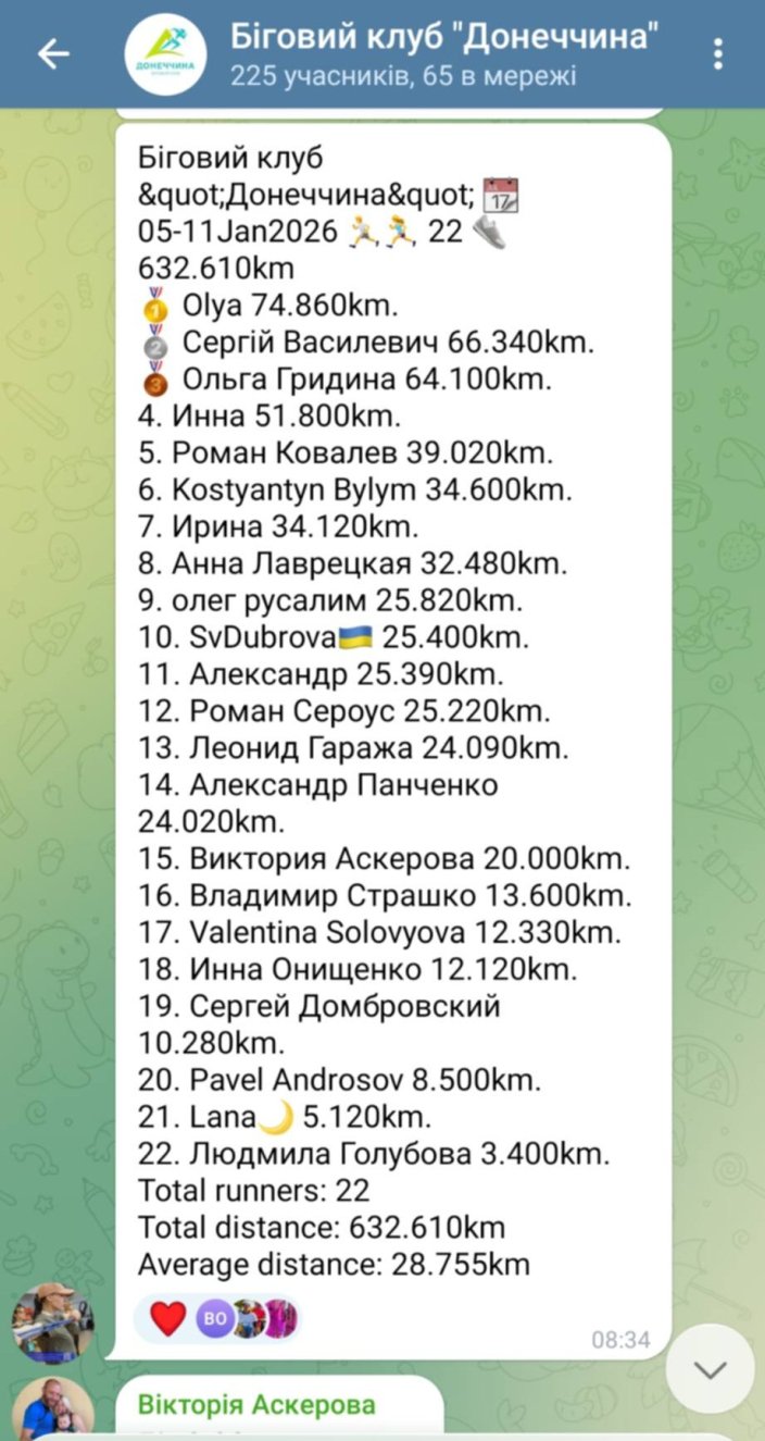 Результати віртуальних змагань (але реальних пробіжок) спортсмени затим фіксують у групі «Біговий клуб Донеччина», створеної у Телеграм. Серед учасників бігового клубу — чоловіки і жінки, молодь і люди старшого віку, жителі прифронтових міст та сіл Донеччини, а також донеччани, що евакуювалися до більш безпечних регіонів України.