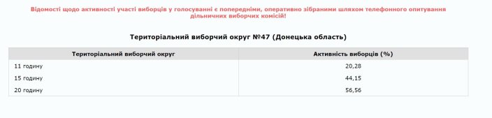 В Центральной избирательной комиссии Украины сообщили, что по состоянию на 20:00 на избирательном округе №47 (Славянск, Святогорск, Славянский и Александровский районы) проголосовали 56,56% избирателей.