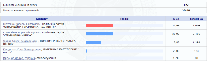 Гнатенко представляет "Оппозиционную платформу За жизнь", он набирает 36,94% голосов. Колесников, представляющий "Оппозиционный блок", получает 35,90%.