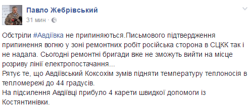 Председатель Донецкой ОВГА Павел Жебривский написал на своей странице в Фейсбуке, что сегодня ремонтным бригадам уже не удастся выйти на линию разрыва электроснабжения:
