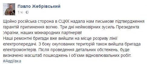 Председатель Донецкой ОВГА Павел Жебривский сообщил, что Россия дала письменные гарантии по прекращению огня в Авдеевке. Об этом он написал на своей странице в Фейсбуке: