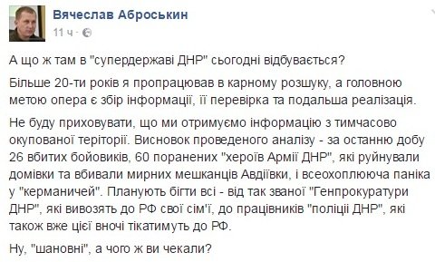 Головна Новини регіону "Силовики ДНР" подготовились к бегству в Россию Категорія Новини регіону Дата публікації 02 лютого 08:55, 2017 "Силовики ДНР" подготовились к бегству в Россию ГригорійКульбака поширити у Facebook поширити у Telegram поширити у Twitter Начальник полиции Донецкой области заявил, что бежать сепаратисты планируют уже этой ночью Начальник полиции Донецкой области Вячеслав Аброськин опубликовал информацию, что в верхушках "ДНР" паника, а тамошние "силовики" собираются бежать в Россию: Більше новин Категорія Новини регіону Дата публікації 28 жовтня 11:39 FT: РФ посилила наступ на сході, ситуація навколо Покровська помітно погіршилася Категорія Новини регіону Дата публікації 17 жовтня 10:50 17 жовтня: як минула доба на Донеччині Категорія Новини регіону Дата публікації 16 жовтня 11:33 16 жовтня: як минула доба на Донеччині Категорія Новини регіону Дата публікації 14 жовтня 11:33 Війська РФ накопичують техніку на Слов’янському напрямку Категорія Новини регіону Дата публікації 13 жовтня 11:33 Обстріли Донецької області за минулу добу: зведення Категорія Новини регіону Дата публікації 10 жовтня 11:33 Обстріл 9 жовтня: у Слов'янську 1 людина загинула і 6 поранені Категорія Новини регіону Дата публікації 09 жовтня 17:18 Внаслідок обстрілів Слов’янська та Костянтинівки одна цивільна загинула і 11 поранено Категорія Новини регіону Дата публікації 08 жовтня 14:43 Росіяни обстріляли Святогірськ: фото наслідків Категорія Новини регіону Дата публікації 06 жовтня 10:31 Добропільський виступ: де просунулися росіяни і де мали успіх ЗСУ — ISW Категорія Новини регіону Дата публікації 02 жовтня 21:59 У Донецькій області розширили зону «довгої» комендантської години