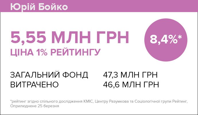 В перерахунку на рейтинг кампанія Бойка виявилась однією із найдешевших і найефективніших – ціна 1% підтримки для нього склала всього 5,5 мільйона гривень.