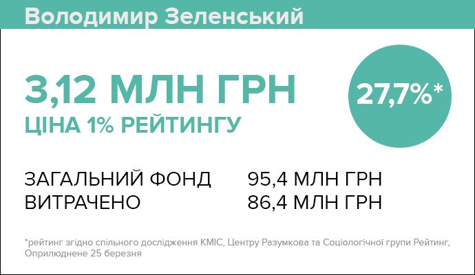 Якщо розділити загальні витрати Зеленського на його рейтинг, то виходить, що 1% електоральної підтримки коштував йому майже 3 мільйони 120 тисяч гривень.
