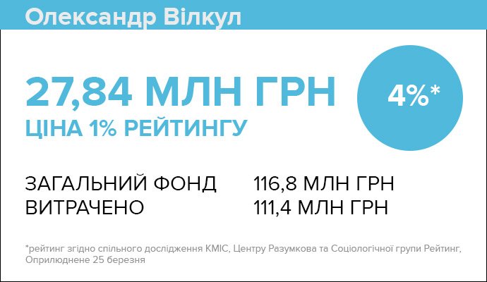 При рейтингу в 4% загальні витрати штабу Вілкула склали більше 111 мільйонів гривень, тобто 1% коштував йому 27,8 мільйона гривень. Дорожче на три мільйони, ніж Порошенку.