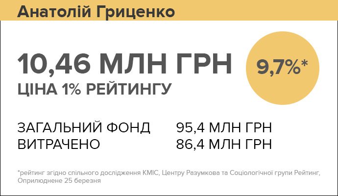 Якщо порахувати співвідношення витрат і рейтингу Гриценка, то 1% підтримки виборців коштував Анатолію Степановичу близько 10,5 мільйона гривень.
