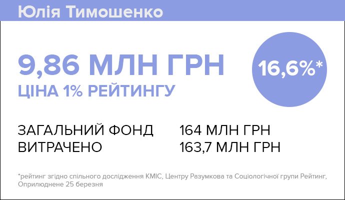Якщо порахувати офіційні витрати ЮВТ, то за один відсоток підтримки їй довелося викласти 9,9 мільйона гривень.