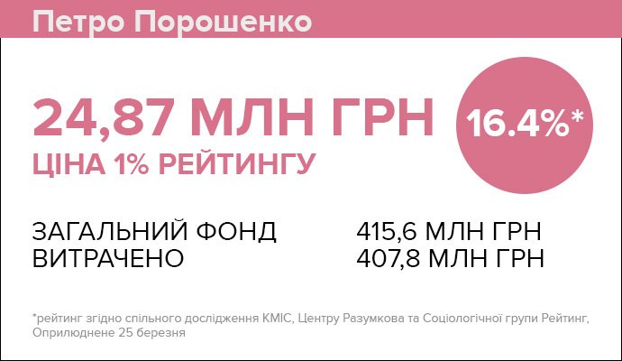 Якщо порахувати, скільки грошей Порошенку довелося витратити на 1% електоральної підтримки, то сума вийде вражаюча – майже 25 мільйонів гривень.