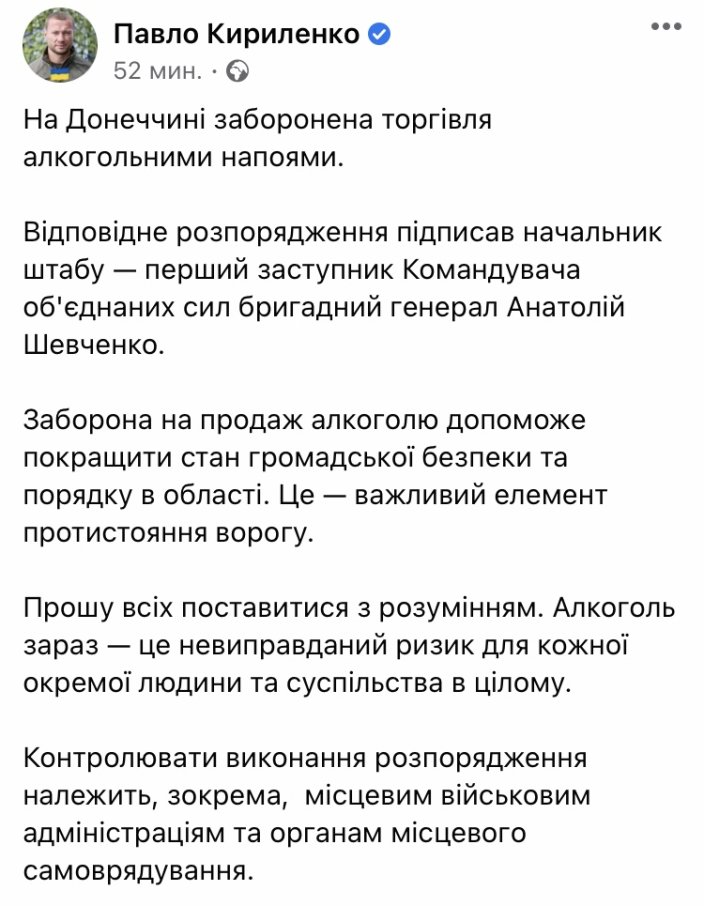 Главная Новости региона В Донецкой области запретили продажу алкоголя Категория Новости региона Дата публикации 01 апреля 12:45, 2022 Кількість переглядів 13 В Донецкой области запретили продажу алкоголя Інтернет-видання"Карачун" поширити у Facebook поширити у Telegram поширити у Twitter Официально Донецкой области запретили продажу алкоголя, – об этом сообщил руководитель ДонОГА Павел Кириленко. Больше новостей Категория Новости региона Дата публикации 09 июня 12:57, 2023 «ДНР» планирует запустить Артемовский завод шампанских вин, заявил Пушилин Категория Новости региона Дата публикации 09 июня 11:22, 2023 Отель Шервуд в Святогорске: уже работает бассейн Категория Новости региона Дата публикации 09 июня 09:50, 2023 Точный удар: в Донецке Силы обороны уничтожили 56 оккупантов Категория Новости региона Дата публикации 09 июня 09:46, 2023 Оперативная ситуация по Донецкой области на утро 9 июня Категория Новости региона Дата публикации 08 июня 11:11, 2023 14 ексспівробітників ДСНС у Лимані зрадили присязі Категория Новости региона Дата публикации 08 июня 10:09, 2023 Россияне убили целую семью и ранили 4 детей в Донецкой области Категория Новости региона Дата публикации 07 июня 17:47, 2023 У Краматорському районі поліція вилучила нелегальний алкоголь на суму понад 7 мільйонів гривень Категория Новости региона Дата публикации 07 июня 16:12, 2023 У Святогірську з'явилась можливість звертатись до комунальників через «гарячу лінію» Категория Новости региона Дата публикации 07 июня 10:19, 2023 Сырский: Враг теряет позиции под Бахмутом Категория Новости региона Дата публикации 07 июня 10:15, 2023 Оперативная ситуация по Донецкой области на утро 7 июня