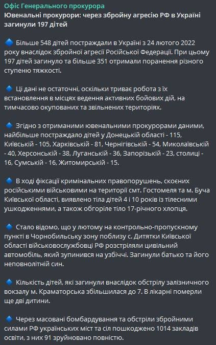 Главная Новости региона В результате взрыва в Краматорске умерли ещё два ребенка Категория Новости региона Дата публикации 14 апреля 09:26, 2022 Кількість переглядів 6 В результате взрыва в Краматорске умерли ещё два ребенка Інтернет-видання"Карачун" поширити у Facebook поширити у Telegram поширити у Twitter Количество жертв возросло В больнице умерли еще два ребенка, которые пострадали от взрыва в Краматорске, сообщили в Офисе генпрокурора.На утро 14 апреля в результате ракетного удара по вокзалу Краматорска погибли 59 человек, среди них 7 детей. Больше новостей Категория Новости региона Дата публикации 09 июня 12:57, 2023 «ДНР» планирует запустить Артемовский завод шампанских вин, заявил Пушилин Категория Новости региона Дата публикации 09 июня 11:22, 2023 Отель Шервуд в Святогорске: уже работает бассейн Категория Новости региона Дата публикации 09 июня 09:50, 2023 Точный удар: в Донецке Силы обороны уничтожили 56 оккупантов Категория Новости региона Дата публикации 09 июня 09:46, 2023 Оперативная ситуация по Донецкой области на утро 9 июня Категория Новости региона Дата публикации 08 июня 11:11, 2023 14 ексспівробітників ДСНС у Лимані зрадили присязі Категория Новости региона Дата публикации 08 июня 10:09, 2023 Россияне убили целую семью и ранили 4 детей в Донецкой области Категория Новости региона Дата публикации 07 июня 17:47, 2023 У Краматорському районі поліція вилучила нелегальний алкоголь на суму понад 7 мільйонів гривень Категория Новости региона Дата публикации 07 июня 16:12, 2023 У Святогірську з'явилась можливість звертатись до комунальників через «гарячу лінію» Категория Новости региона Дата публикации 07 июня 10:19, 2023 Сырский: Враг теряет позиции под Бахмутом Категория Новости региона Дата публикации 07 июня 10:15, 2023 Оперативная ситуация по Донецкой области на утро 7 июня