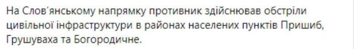 Так, были совершены обстрелы гражданской инфраструктуры в районах населенных пунктов Богородичное, Пришиб, Грушеваха.