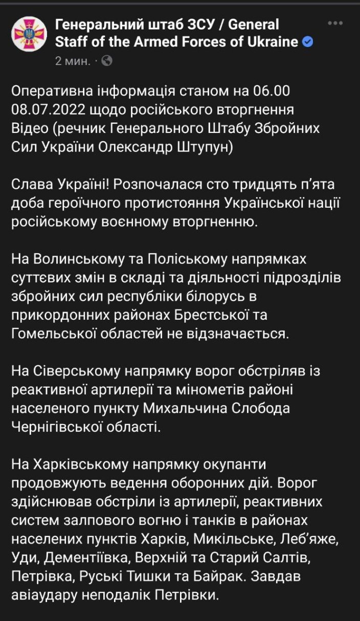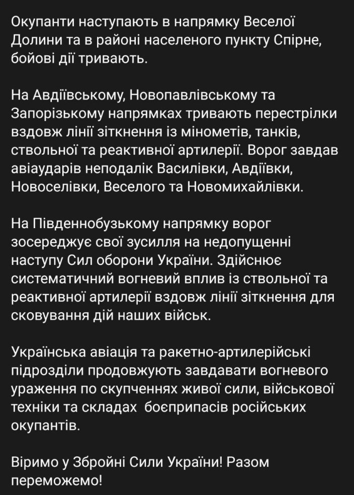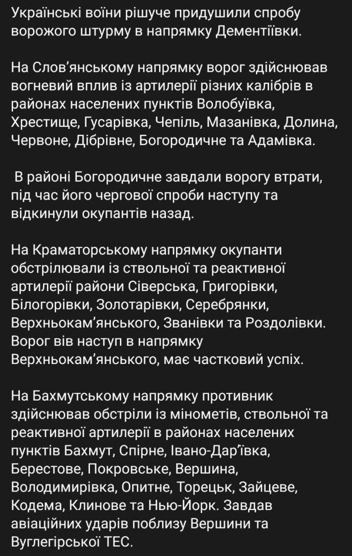 На Славянском направлении враг оказывал огненное влияние из артиллерии разных калибров в районах населенных пунктов Волобуевка, Крестище, Гусаровка, Чеполь, Мазановка, Долина, Красное, Дибровное, Богородичное и Адамовка.