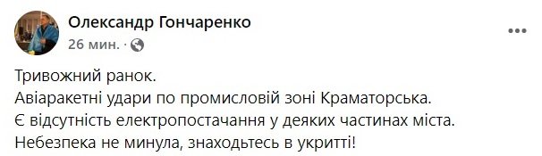 Главная Новости региона По Краматорску нанесен ракетный авиаудар Категория Новости региона Дата публикации 14 июля 07:53, 2022 Кількість переглядів 7 По Краматорску нанесен ракетный авиаудар Інтернет-видання"Карачун" поширити у Facebook поширити у Telegram поширити у Twitter Информацию подтвердил Александр Гончаренко Иллюстративное фотоПроизошел ракетный авиаудар по промышленной зоне Краматорска. Руководитель Краматорской военной администрации Александр Гончаренко призывает жителей не покидать укрытий. Больше новостей Категория Новости региона Дата публикации 09 июня 12:57, 2023 «ДНР» планирует запустить Артемовский завод шампанских вин, заявил Пушилин Категория Новости региона Дата публикации 09 июня 11:22, 2023 Отель Шервуд в Святогорске: уже работает бассейн Категория Новости региона Дата публикации 09 июня 09:50, 2023 Точный удар: в Донецке Силы обороны уничтожили 56 оккупантов Категория Новости региона Дата публикации 09 июня 09:46, 2023 Оперативная ситуация по Донецкой области на утро 9 июня Категория Новости региона Дата публикации 08 июня 11:11, 2023 14 ексспівробітників ДСНС у Лимані зрадили присязі Категория Новости региона Дата публикации 08 июня 10:09, 2023 Россияне убили целую семью и ранили 4 детей в Донецкой области Категория Новости региона Дата публикации 07 июня 17:47, 2023 У Краматорському районі поліція вилучила нелегальний алкоголь на суму понад 7 мільйонів гривень Категория Новости региона Дата публикации 07 июня 16:12, 2023 У Святогірську з'явилась можливість звертатись до комунальників через «гарячу лінію» Категория Новости региона Дата публикации 07 июня 10:19, 2023 Сырский: Враг теряет позиции под Бахмутом Категория Новости региона Дата публикации 07 июня 10:15, 2023 Оперативная ситуация по Донецкой области на утро 7 июня