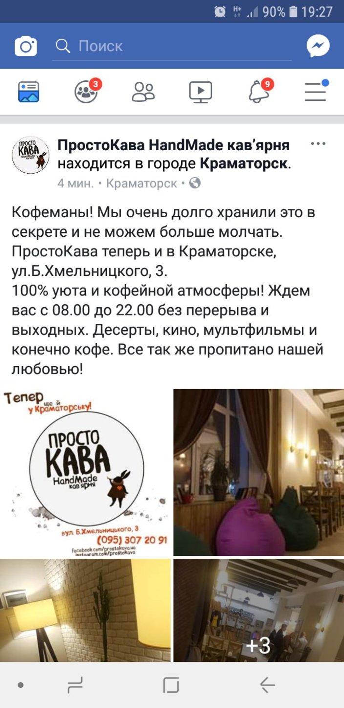 Главная Новости региона ПростоКава открылась в Краматорске Категория Новости региона Дата публикации 23 ноября 06:49, 2018 Кількість переглядів 9 ПростоКава открылась в Краматорске ГригорійКульбака поширити у Facebook поширити у Telegram поширити у Twitter Наши расширяются :) Вчера на фейсбук-страничке кофейни ПростоКава появилась информация о том, что аналогичное заведение открылось в Краматорске.Адрес кофейни ПростоКава в Краматорске -ул.Б.Хмельницкого, 3. Больше новостей Категория Новости региона Дата публикации 09 июня 12:57, 2023 «ДНР» планирует запустить Артемовский завод шампанских вин, заявил Пушилин Категория Новости региона Дата публикации 09 июня 11:22, 2023 Отель Шервуд в Святогорске: уже работает бассейн Категория Новости региона Дата публикации 09 июня 09:50, 2023 Точный удар: в Донецке Силы обороны уничтожили 56 оккупантов Категория Новости региона Дата публикации 09 июня 09:46, 2023 Оперативная ситуация по Донецкой области на утро 9 июня Категория Новости региона Дата публикации 08 июня 11:11, 2023 14 ексспівробітників ДСНС у Лимані зрадили присязі Категория Новости региона Дата публикации 08 июня 10:09, 2023 Россияне убили целую семью и ранили 4 детей в Донецкой области Категория Новости региона Дата публикации 07 июня 17:47, 2023 У Краматорському районі поліція вилучила нелегальний алкоголь на суму понад 7 мільйонів гривень Категория Новости региона Дата публикации 07 июня 16:12, 2023 У Святогірську з'явилась можливість звертатись до комунальників через «гарячу лінію» Категория Новости региона Дата публикации 07 июня 10:19, 2023 Сырский: Враг теряет позиции под Бахмутом Категория Новости региона Дата публикации 07 июня 10:15, 2023 Оперативная ситуация по Донецкой области на утро 7 июня