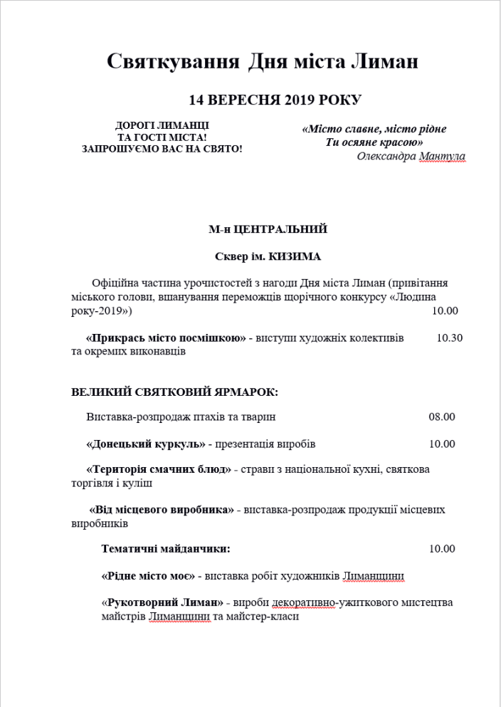 Главная Новости региона Как Лиман отпразднует День города Категория Новости региона Дата публикации 11 сентября 07:59, 2019 Кількість переглядів 27 Как Лиман отпразднует День города Інтернет-видання"Карачун" поширити у Facebook поширити у Telegram поширити у Twitter Кто приедет развлекать лиманцев? 14 сентября свой День рождения отпразднует город Лиман. "Карачун" публикует афишу мероприятий: Больше новостей Категория Новости региона Дата публикации 09 июня 12:57, 2023 «ДНР» планирует запустить Артемовский завод шампанских вин, заявил Пушилин Категория Новости региона Дата публикации 09 июня 11:22, 2023 Отель Шервуд в Святогорске: уже работает бассейн Категория Новости региона Дата публикации 09 июня 09:50, 2023 Точный удар: в Донецке Силы обороны уничтожили 56 оккупантов Категория Новости региона Дата публикации 09 июня 09:46, 2023 Оперативная ситуация по Донецкой области на утро 9 июня Категория Новости региона Дата публикации 08 июня 11:11, 2023 14 ексспівробітників ДСНС у Лимані зрадили присязі Категория Новости региона Дата публикации 08 июня 10:09, 2023 Россияне убили целую семью и ранили 4 детей в Донецкой области Категория Новости региона Дата публикации 07 июня 17:47, 2023 У Краматорському районі поліція вилучила нелегальний алкоголь на суму понад 7 мільйонів гривень Категория Новости региона Дата публикации 07 июня 16:12, 2023 У Святогірську з'явилась можливість звертатись до комунальників через «гарячу лінію» Категория Новости региона Дата публикации 07 июня 10:19, 2023 Сырский: Враг теряет позиции под Бахмутом Категория Новости региона Дата публикации 07 июня 10:15, 2023 Оперативная ситуация по Донецкой области на утро 7 июня