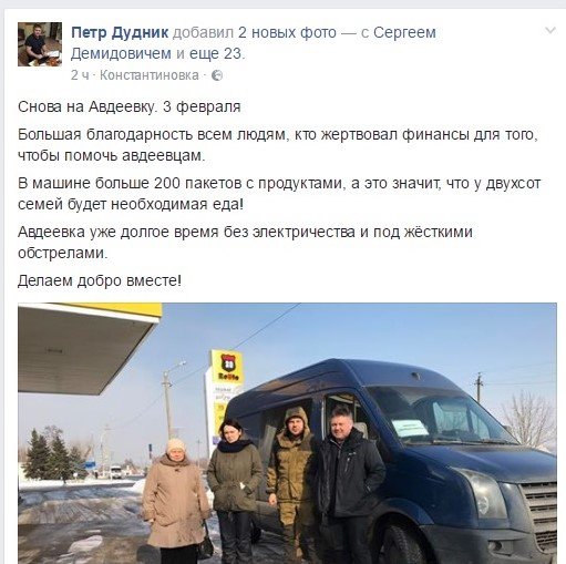 Славянский волонтёр и священнослужитель Пётр Дудник написал на своей странице в Фейсбуке, что они вновь отправляются в Авдеевку, разумеется, не с пустыми руками.