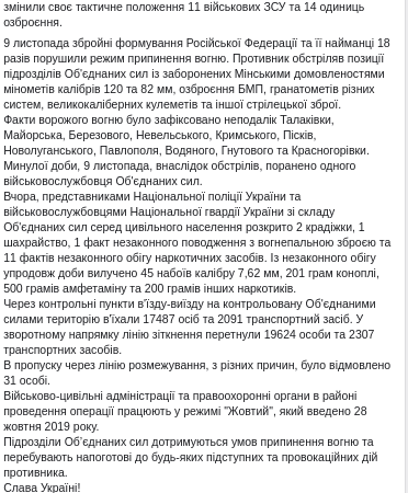 С начала суток 10 ноября сепаратисты пять раз нарушили режим прекращения огня. Позиции украинских подразделений обстреляли из противотанкового ракетного комплекса. Об этом сообщают в пресс-службе штаба ООС.