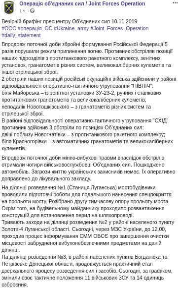 "На протяжении текущих суток минно-взрывные травмы в результате обстрелов получили четверо военнослужащих Объединенных сил. Поврежден автомобиль. Угрозы жизни украинских защитников нет. Их оперативно доставили в лечебное учреждение", – говорится в сводке штаба ООС.