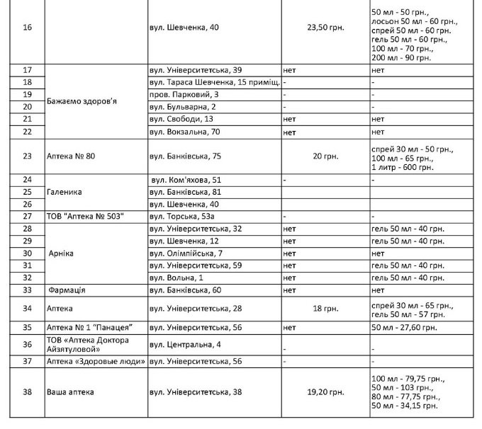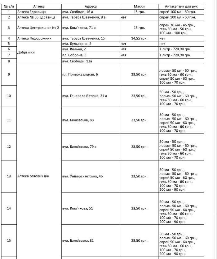 Слов'янська міська рада інформує про наявність захисних масок та антисептиків для обробки рук в аптечних закладах міста Слов'янськ станом на 10.04.2020 р.