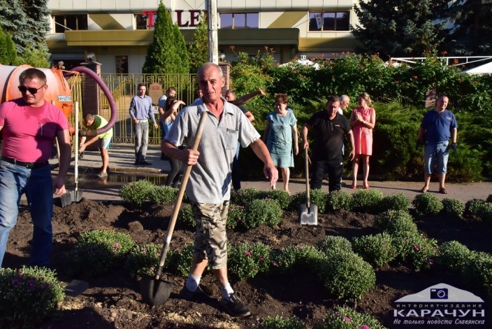 Также сегодня после окончания рабочего дня сотрудники аппарата исполнительного комитета Славянского городского совета и работники КП «Благоустройство» вооружились лопатами и тоже направились на бульвар Пушкина, чтобы озеленить свою клумбу. Для этого из экологического фонда было выделено 40 000 гривен на закупку 550 кустов шаровидной хризантемы пяти сортов.