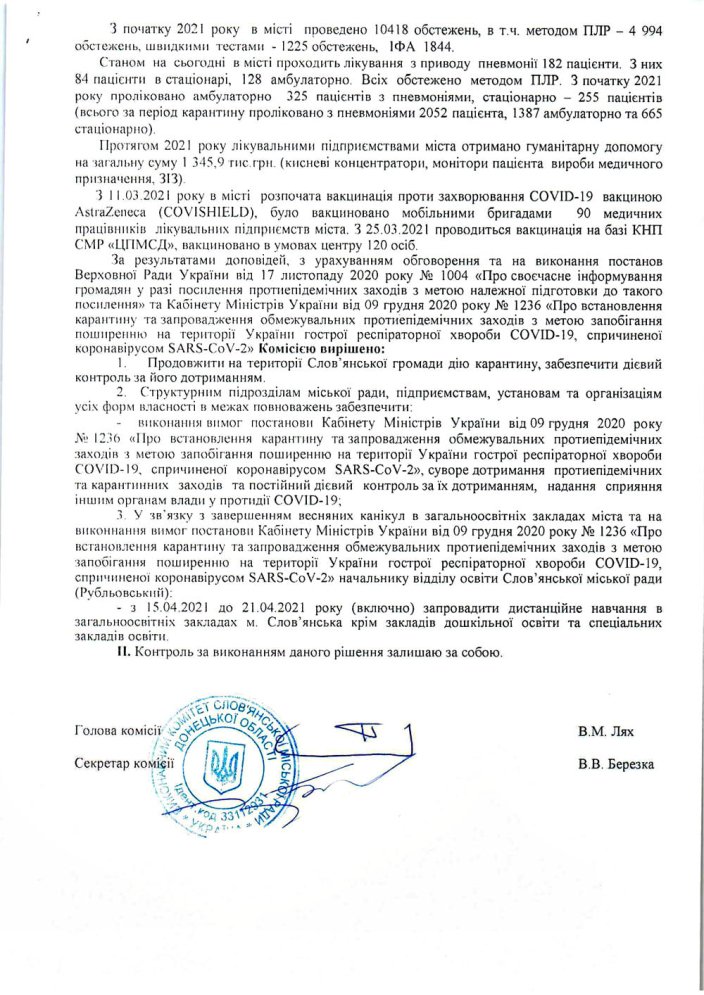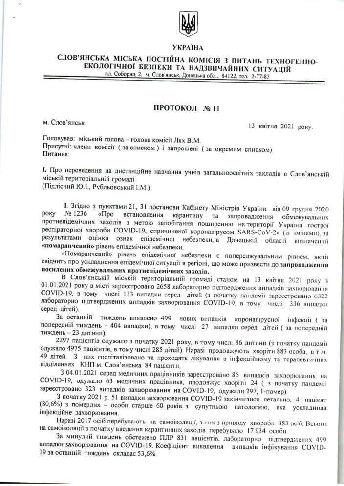 Сегодня в Славянске состоялось заседание комиссии по ЧС. Было принято решение оставить школьников на дистанционном обучении с 15 по 21 апреля. Ниже публикуем протокол заседания: