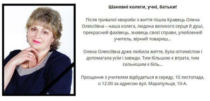 Главная Новости Славянска В Славянске ушла из жизни Елена Кравец Категория Новости Славянска Дата публикации 09 ноября 09:59, 2021 Кількість переглядів 11 В Славянске ушла из жизни Елена Кравец Інтернет-видання"Карачун" поширити у Facebook поширити у Telegram поширити у Twitter Каким человеком она была... Коллектив Славянского педагогического лицея Больше новостей Категория Новости Славянска Дата публикации 09 июня 17:15, 2023 Вниманию читателей интернет-издания «Карачун» Категория Новости Славянска Дата публикации 09 июня 11:03, 2023 Какие банковские отделения и банкоматы на сегодня работают в Славянске Категория Новости Славянска Дата публикации 09 июня 10:06, 2023 Завтра починає діяти літній графік руху поїздів по станції Слов’янськ Категория Новости Славянска Дата публикации 08 июня 15:19, 2023 Робота у Слов'янську: список вакансій Категория Новости Славянска Дата публикации 08 июня 09:57, 2023 Жителька Слов'янська підозрюється у коригуванні вогню по місцях дислокації ЗСУ у місті Категория Новости Славянска Дата публикации 07 июня 17:10, 2023 Суд по делу Нели Штепы отложили на неизвестный срок Категория Новости Славянска Дата публикации 07 июня 16:17, 2023 У Слов’янську водій BMW пропонував 400 доларів поліцейським: ймовірно, був напідпитку Категория Новости Славянска Дата публикации 07 июня 13:53, 2023 Концентрація аміаку у Слов’янську: військова адміністрація повідомила результати проб повітря Категория Новости Славянска Дата публикации 07 июня 13:19, 2023 У Слов’янську збільшується кількість рейсів тролейбусів Категория Новости Славянска Дата публикации 05 июня 11:56, 2023 В автопарке Славянска пополнение