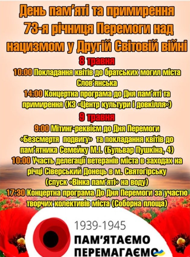 Главная Новости Славянска Праздничная афиша: что запланировано в Славянске ко Дню Победы Категория Новости Славянска Дата публикации 08 мая 09:36, 2018 Кількість переглядів 7 Праздничная афиша: что запланировано в Славянске ко Дню Победы ГригорійКульбака поширити у Facebook поширити у Telegram поширити у Twitter Расписание мероприятий В Славянске ко Дню Победы запланировано несколько мероприятий: Больше новостей Категория Новости Славянска Дата публикации 09 июня 17:15, 2023 Вниманию читателей интернет-издания «Карачун» Категория Новости Славянска Дата публикации 09 июня 11:03, 2023 Какие банковские отделения и банкоматы на сегодня работают в Славянске Категория Новости Славянска Дата публикации 09 июня 10:06, 2023 Завтра починає діяти літній графік руху поїздів по станції Слов’янськ Категория Новости Славянска Дата публикации 08 июня 15:19, 2023 Робота у Слов'янську: список вакансій Категория Новости Славянска Дата публикации 08 июня 09:57, 2023 Жителька Слов'янська підозрюється у коригуванні вогню по місцях дислокації ЗСУ у місті Категория Новости Славянска Дата публикации 07 июня 17:10, 2023 Суд по делу Нели Штепы отложили на неизвестный срок Категория Новости Славянска Дата публикации 07 июня 16:17, 2023 У Слов’янську водій BMW пропонував 400 доларів поліцейським: ймовірно, був напідпитку Категория Новости Славянска Дата публикации 07 июня 13:53, 2023 Концентрація аміаку у Слов’янську: військова адміністрація повідомила результати проб повітря Категория Новости Славянска Дата публикации 07 июня 13:19, 2023 У Слов’янську збільшується кількість рейсів тролейбусів Категория Новости Славянска Дата публикации 05 июня 11:56, 2023 В автопарке Славянска пополнение