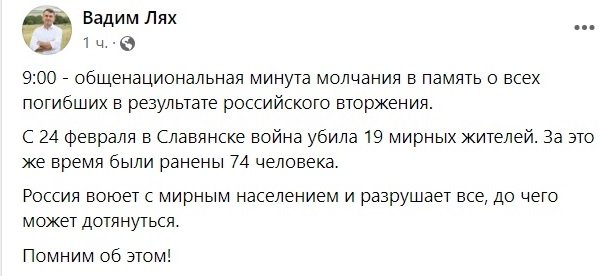 Главная Новости Славянска В Славянске погибли 19 мирных жителей с начала полномасштабной войны Категория Новости Славянска Дата публикации 17 июля 10:04, 2022 В Славянске погибли 19 мирных жителей с начала полномасштабной войны Інтернет-видання"Карачун" поширити у Facebook поширити у Telegram поширити у Twitter Статистика будет ухудшаться... Руководитель Славянской ВА Вадим Лях сообщил, что с 24 февраля в Славянске война убила 19 мирных жителей. За это же время были ранены 74 человека.Берегите себя и эвакуируйтесь! Больше новостей Категория Новости Славянска Дата публикации 09 июня 17:15, 2023 Вниманию читателей интернет-издания «Карачун» Категория Новости Славянска Дата публикации 09 июня 11:03, 2023 Какие банковские отделения и банкоматы на сегодня работают в Славянске Категория Новости Славянска Дата публикации 09 июня 10:06, 2023 Завтра починає діяти літній графік руху поїздів по станції Слов’янськ Категория Новости Славянска Дата публикации 08 июня 15:19, 2023 Робота у Слов'янську: список вакансій Категория Новости Славянска Дата публикации 08 июня 09:57, 2023 Жителька Слов'янська підозрюється у коригуванні вогню по місцях дислокації ЗСУ у місті Категория Новости Славянска Дата публикации 07 июня 17:10, 2023 Суд по делу Нели Штепы отложили на неизвестный срок Категория Новости Славянска Дата публикации 07 июня 16:17, 2023 У Слов’янську водій BMW пропонував 400 доларів поліцейським: ймовірно, був напідпитку Категория Новости Славянска Дата публикации 07 июня 13:53, 2023 Концентрація аміаку у Слов’янську: військова адміністрація повідомила результати проб повітря Категория Новости Славянска Дата публикации 07 июня 13:19, 2023 У Слов’янську збільшується кількість рейсів тролейбусів Категория Новости Славянска Дата публикации 05 июня 11:56, 2023 В автопарке Славянска пополнение
