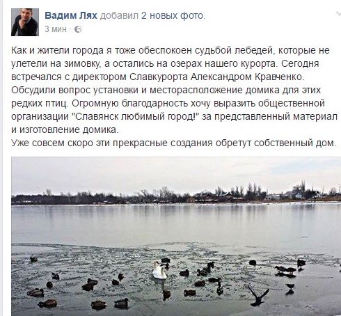 Только что на странице Славянского городского головы Вадим Ляха в Фейсбуке появилась информация о том, что мэр обеспокоен судьбой лебедей, которые не улетели на зимовку, а остались на озерах нашего курорта.