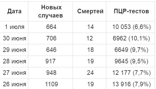 Если сравнить три последних дня и предыдущую триаду, то картина будет следующей. ПЦР-тестов 26-28 июня было сделано 35 738. А с 29 июня по 1 июля – только 23 664.