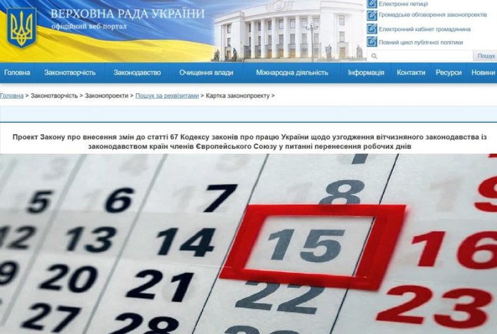 Указанным документом предлагаются изменения в статью 67 Кодекса законов о труде в части согласования отечественного законодательства с законодательством стран-членов Европейского Союза в вопросе переноса рабочих дней. Авторами законопроекта выступила группа депутатов от партии "Слуга народа", в числе которых – глава парламентского комитета по вопросам социальной политики и защиты прав ветеранов Галина Третьякова. Источник – Обозреватель.