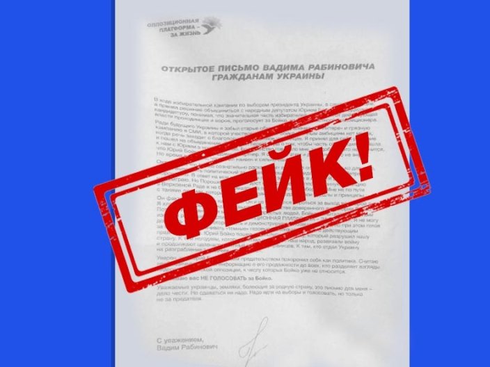 В преддверии выборов нынешний режим использует любые противозаконные методы и средства, чтобы удержаться у власти, заявляет ОППОЗИЦИОННАЯ ПЛАТФОРМА – ЗА ЖИЗНЬ. Жители украинских городов стали получать по почте фейковые письма якобы от Вадима Рабиновича, в которых он обвиняет Юрия Бойко в расколе оппозиции и призывает не голосовать за него на президентских выборах. Это свидетельство того, что власть боится единственного реального кандидата от оппозиции.
