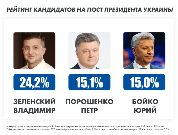 По результатам опроса, проведенного в конце марта международным исследовательским центром The Belgium-Ukraine Research Institute (Бельгия), за Владимира Зеленского готовы голосовать 24,2% избирателей, за Петра Порошенко – 15,1%, за Юрия Бойко – 15,0%, за Юлию Тимошенко – 14,7%.
