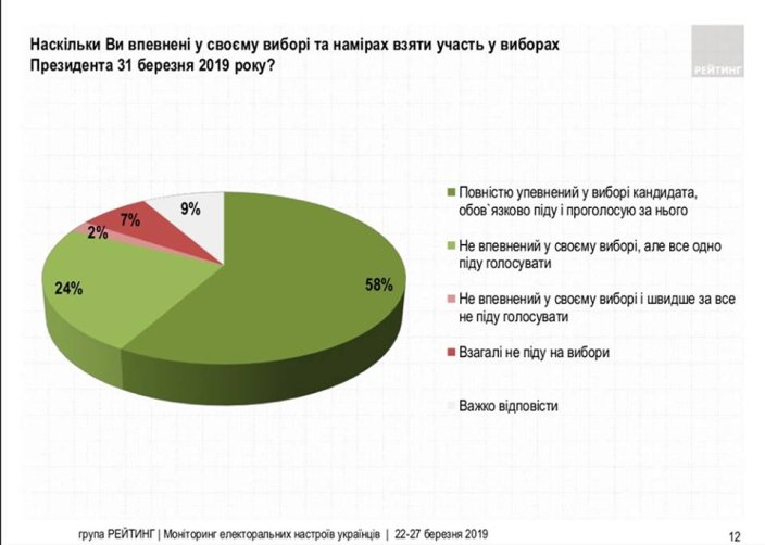 По итогам третьей недели марта, более 80% опрошенных в той или иной степени декларируют свою готовность принять участие в выборах президента 31 марта 2019 Года. Таковы результаты опроса, проведенного соцгруппой Рейтинг. Источник - Лига.