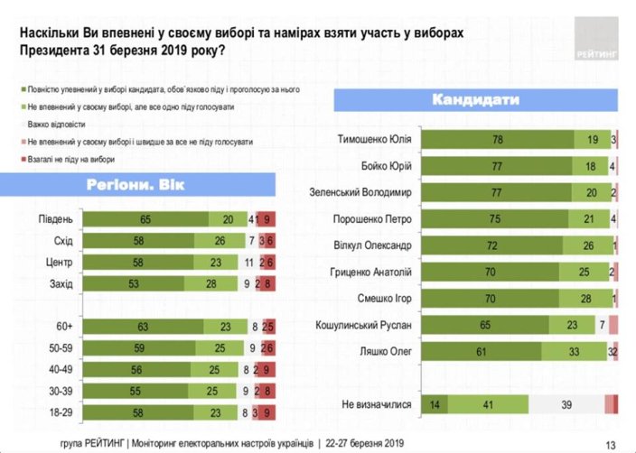 Опрос проводился 22-27 марта 2019 года среди 3000 избирателей во всех регионах Украины, кроме временно оккупированных территорий Крыма и Донбасса. Погрешность составила не более 1,8%.