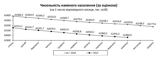 По оценке статистического ведомства, численность наличного населения в Украине на 1 октября 2019 года составляла 41960,0 тысяч человек. Таким образом, за сентябрь население сократилось на 16,2 тыс. человек.