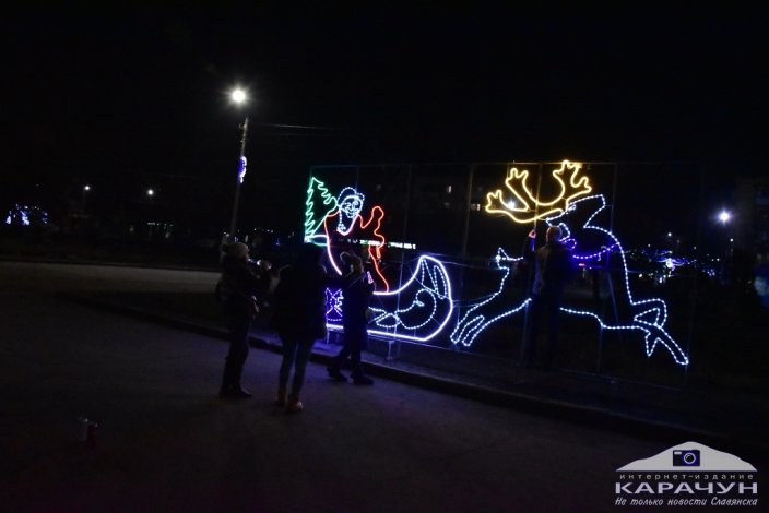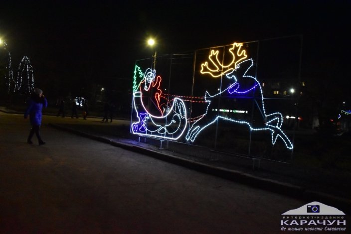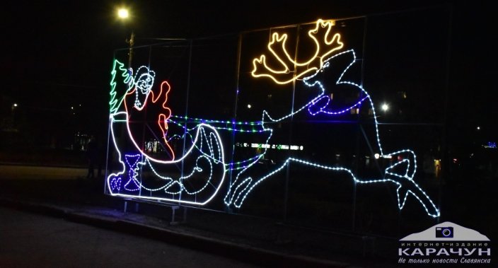 Сегодня вечером в Славянске на Соборной площади зажглись новые иллюминации: светящаяся фигура Деда Мороза, который едет в санях на оленях.