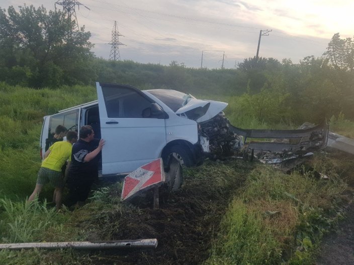 Водитель микроавтобуса Volkswagen не справился с управлением, врезался в столб и оказался в кювете.