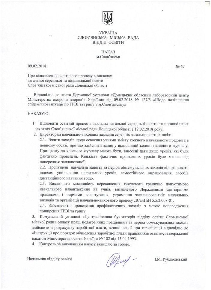 Головна Новини Словʼянська Стало известно, когда в Славянске возобновятся занятия в школах Категорія Новини Словʼянська Дата публікації 09 лютого 12:54, 2018 Кількість переглядів 5 Стало известно, когда в Славянске возобновятся занятия в школах ГригорійКульбака поширити у Facebook поширити у Telegram поширити у Twitter Есть приказ Сегодня на сайте отдела образования Славянского городского совета был опубликован приказ о возобновлении образовательного процесса.В нём говорится, что занятия возобновятся уже с понедельника – 12 февраля. Більше новин Категорія Новини Словʼянська Дата публікації 07 листопада 10:31 Обстріл Слов'янська ввечері 6 листопада: наслідки Категорія Новини Словʼянська Дата публікації 05 листопада 20:53 Слов'янськ знову під обстрілом: фото Категорія Новини Словʼянська Дата публікації 05 листопада 20:23 ⚡️ Зупиняється рух поїздів до Слов’янська та Краматорська Категорія Новини Словʼянська Дата публікації 05 листопада 09:28 Слов’янськ тричі був під російськими обстрілами: є потерпілий Категорія Новини Словʼянська Дата публікації 04 листопада 09:20 Ранок 4 листопада: наслідки обстрілу Слов’янська Категорія Новини Словʼянська Дата публікації 02 листопада 10:28 У Слов'янську прильоти і руйнування Категорія Новини Словʼянська Дата публікації 01 листопада 16:05 Обстріл Слов'янська: наслідки на ранок 1 листопада Категорія Новини Словʼянська Дата публікації 31 жовтня 10:11 Проблеми з напругою: які наслідки для мешканців Слов'янська Категорія Новини Словʼянська Дата публікації 31 жовтня 10:03 На Слов'янськ скинули КАБи: наслідки Категорія Новини Словʼянська Дата публікації 30 жовтня 10:00 У Слов’янську повідомляють про вибухи