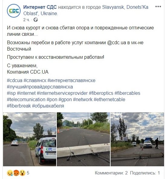 Головна Новини Словʼянська ДТП на Славкурорте: сбита электроопора Категорія Новини Словʼянська Дата публікації 29 червня 18:11, 2019 Кількість переглядів 3 ДТП на Славкурорте: сбита электроопора Інтернет-видання"Карачун" поширити у Facebook поширити у Telegram поширити у Twitter Возможны перебои с интернетом Сегодня в Славянске произошло очередное ДТП. Так, на дороге в районе Славянского курорта в результате ДТП была сбита электроопора. Об этом на своей странице в Фейсбук сообщает интернет-провайдер СДС: Більше новин Категорія Новини Словʼянська Дата публікації 27 жовтня 17:30 Увечері 26 жовтня Слов'янськ знову був під обстрілом: наслідки Категорія Новини Словʼянська Дата публікації 26 жовтня 12:35 Росіяни атакували центр Слов’янська: є пошкодження Категорія Новини Словʼянська Дата публікації 20 жовтня 09:34 Вночі Слов'янськ був під обстрілом: подробиці Категорія Новини Словʼянська Дата публікації 15 жовтня 09:57 У Слов'янську під удар потрапила одна зі шкіл Категорія Новини Словʼянська Дата публікації 14 жовтня 11:40 Близько 10:00 росіяни знову обстріляли Слов'янськ Категорія Новини Словʼянська Дата публікації 12 жовтня 11:29 Слов'янськ знеструмлений: води немає, тролейбуси стоять Категорія Новини Словʼянська Дата публікації 09 жовтня 14:24 Жителям Слов'янська настав час евакуюватися: ситуація погіршується Категорія Новини Словʼянська Дата публікації 09 жовтня 10:15 Слов'янськ знову зазнав обстрілу Категорія Новини Словʼянська Дата публікації 07 жовтня 08:41 У Слов'янську - загроза вибухів після нічного обстрілу Категорія Новини Словʼянська Дата публікації 05 жовтня 13:25 У пошкодженій обстрілом дев’ятиповерхівці в центрі Слов’янська відключили газопостачання