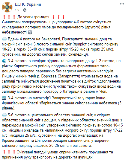 Уточняется, что днем 4 февраля на Закарпатье и в Прикарпатье ожидается значительный дождь и мокрый снег, ночью 5 февраля сильный снег (прирост снежного покрова 10-20 см, в горах 35-40 см); порывы ветра 15-20 м/с (в горах 25 м/с), метель, на дорогах снежные заносы, гололедица.