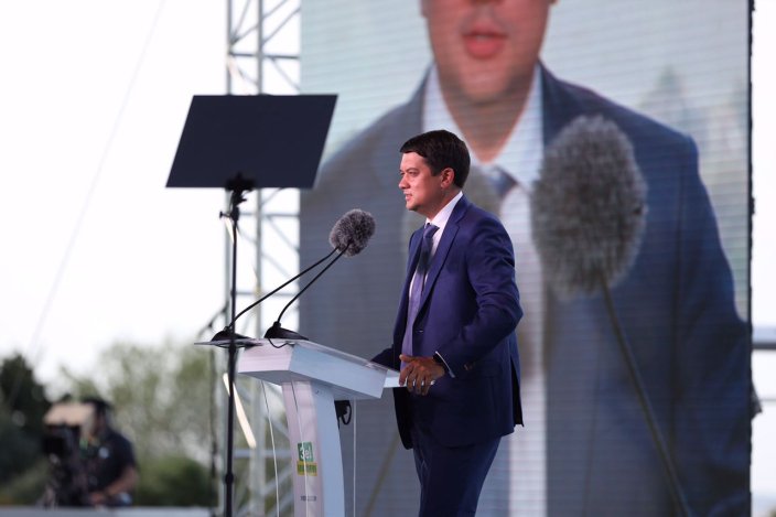 Далі слово взяв Денис Шмигаль. Прем’єр не був багатослівним, побажав кандидатам перемоги й пообіцяв, що уряд докладе всіх зусиль, щоб українці відчули «синергію влади в Україні».