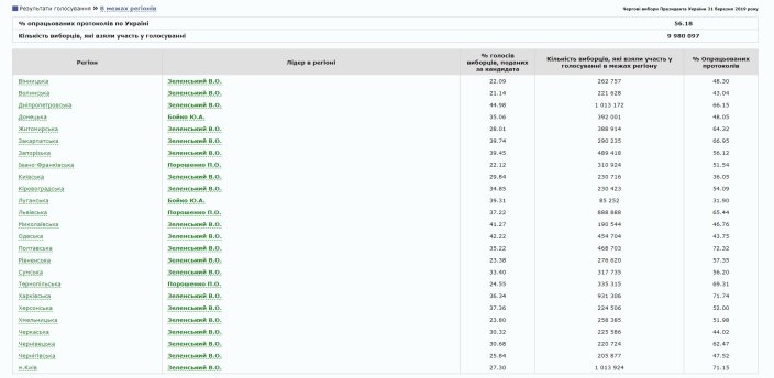 Головна Новини України Кто в каких регионах побеждает: таблица Категорія Новини України Дата публікації 01 квітня 09:32, 2019 Кількість переглядів 9 Кто в каких регионах побеждает: таблица Інтернет-видання"Карачун" поширити у Facebook поширити у Telegram поширити у Twitter Обработано 56,18% По состоянию на данный момент ЦИК обработала 56,18% протоколов.Ниже публикуем таблицу лидерства кандидатов по регионам: Більше новин Категорія Новини України Дата публікації 12:56 В Кремлі прокоментували повідомлення ЗМІ про нові зусилля щодо досягнення миру в Україні Категорія Новини України Дата публікації 18 листопада 18:12 "Укрзалізниця" запустила продаж онлайн-квитків на приміські поїзди Категорія Новини України Дата публікації 17 листопада 17:10 Умєров уже в США. РНБО каже про відрядження, але є нюанси Категорія Новини України Дата публікації 14 листопада 11:29 Покарання за ухилення від мобілізації: чи можуть їх скасувати після війни Категорія Новини України Дата публікації 12 листопада 11:40 У Покровськ армія РФ затягнула міномети та іншу техніку — ЗМІ Категорія Новини України Дата публікації 12 листопада 11:37 Чому спроби Трампа завершити війну РФ проти України продовжують зазнавати невдач — The Atlantic Категорія Новини України Дата публікації 10 листопада 10:11 Оформлення відстрочки: хто це може зробити у ЦНАПі Категорія Новини України Дата публікації 08 листопада 11:33 Затримки до 6 годин: обстріли РФ зірвали графік руху поїздів Категорія Новини України Дата публікації 06 листопада 10:09 Ворожі обстріли спричинили затримку поїздів "Укрзалізниці" Категорія Новини України Дата публікації 04 листопада 11:29 Єврокомісія вимагатиме від України повернутись до антикорупційного курсу та посилити верховенство права — Reuters