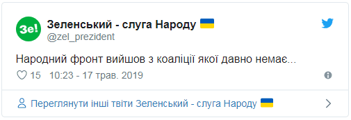 Команда избранного президента Украины Владимира Зеленского заявила, что фракция "Народный фронт" вышла из коалиции, которой давно нет. Об этом говорится на странице "Зеленский – слуга Народа" в Twitter.
