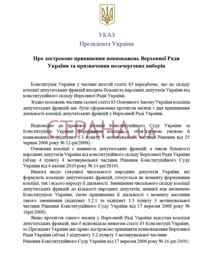 "Если в течение одного месяца в Верховной Раде Украины отсутствует коалиция депутатских фракций, которая бы отвечала требованиям статьи 83 Конституции Украины, то президент Украины имеет право досрочно прекратить полномочия Верховной Рады Украины", – говорится в проекте Указа.